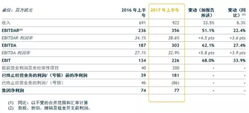 2017年上半年,整合后的EBITDA達3.03億歐元,同比增長27.4%,報告增長62.1%。EBITDA利潤率達到32.9%,同比增長3.9%。