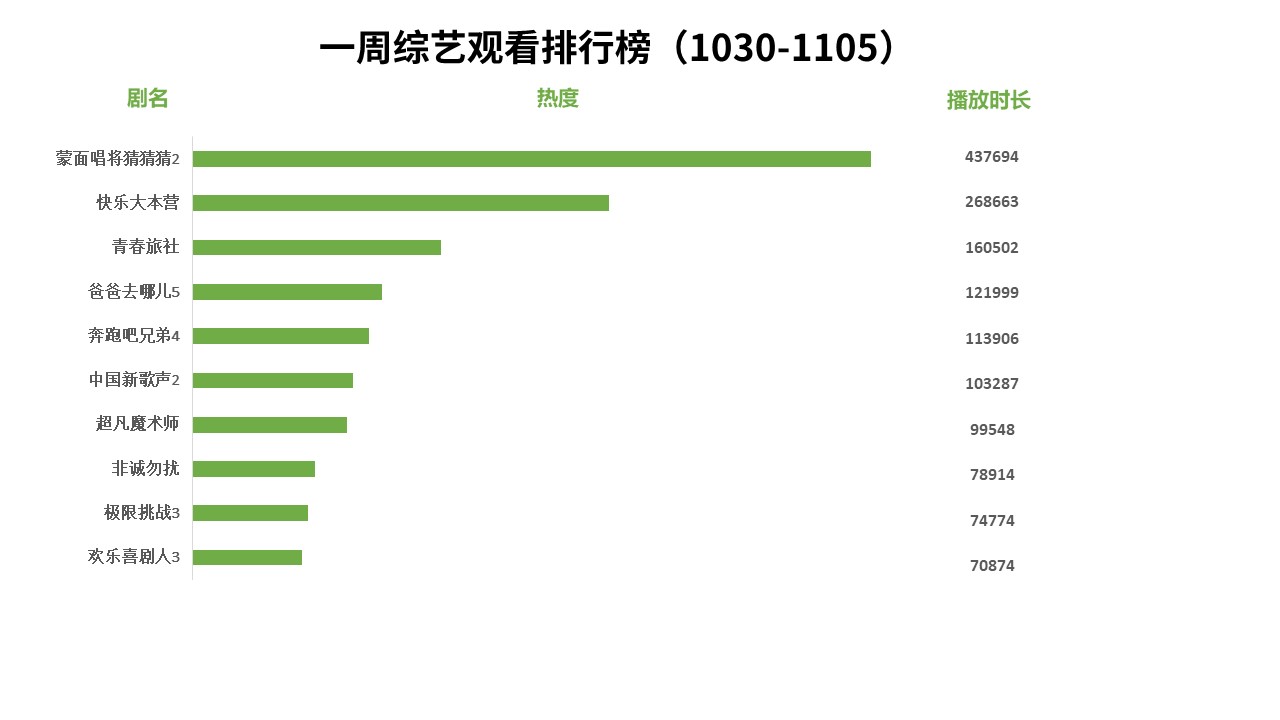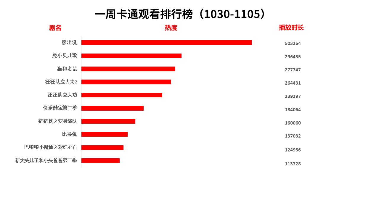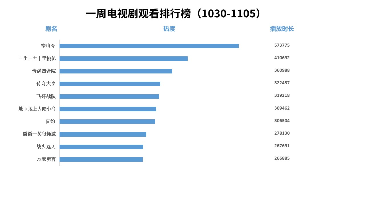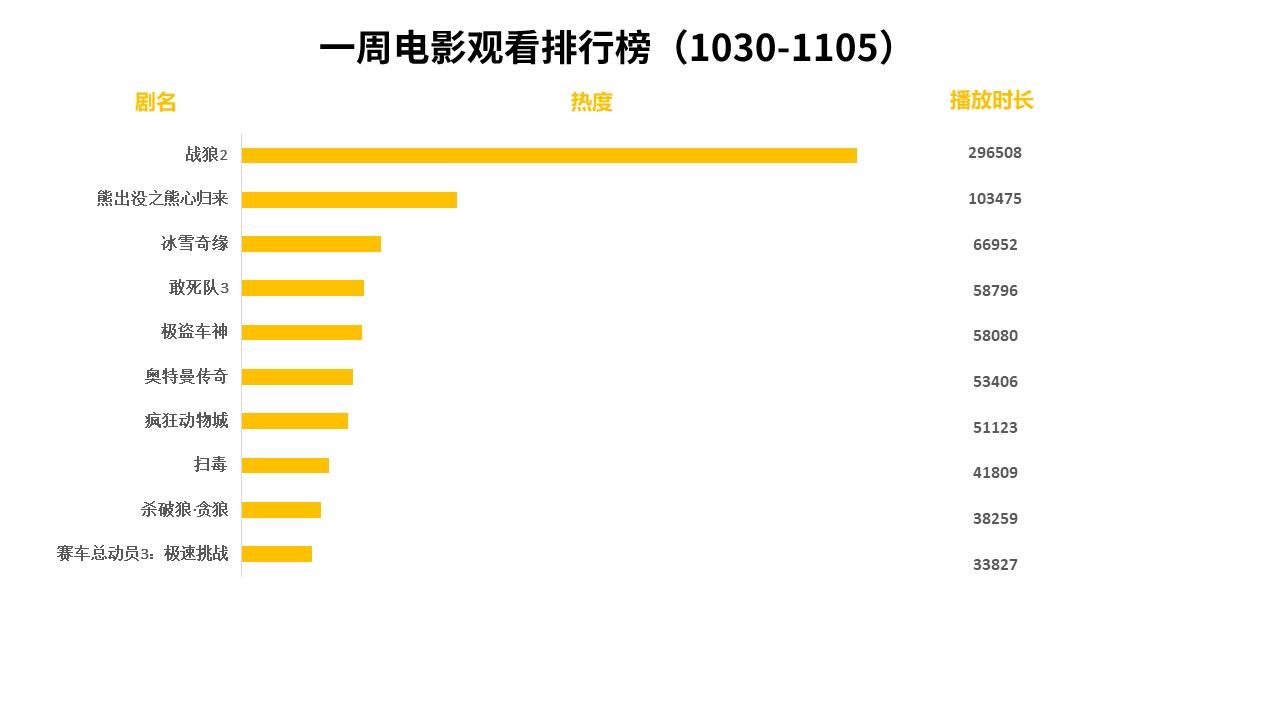 新聞來源:宏輝智通 發布日期:2017-11-09 瀏覽次數:2916廣東IPTV發布IPTV10月30日-11月5日電視劇、電影、綜藝、卡通節目觀看排行榜。電視劇觀看排行榜前三位是《寒山令》、《三生三世十里桃花》、《情滿四合院》; 電影觀看排行榜前三位是《戰狼2》、《熊出沒之熊心歸來》、《冰雪奇緣》;綜藝觀看排行榜前三甲《蒙面唱將猜猜猜2》、《快樂大本營》、《青春旅社》;卡通觀看排行榜前三位是《熊出沒》《兔小貝兒歌》、《貓和老鼠》。