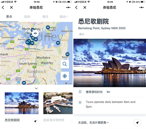 去悉尼旅游時,到達目的地之后,只要用微信打開“體驗悉尼”,小程序就會根據你的地理位置為你推薦附近的旅游景點。