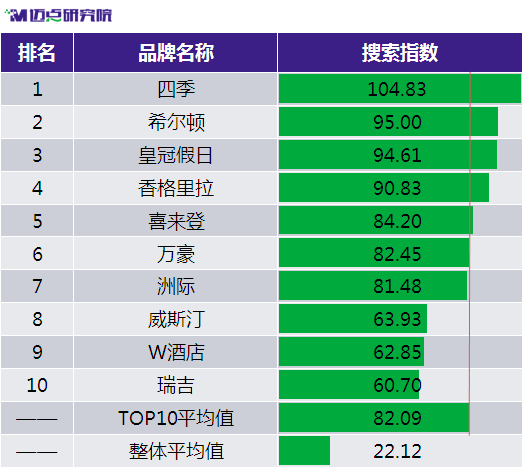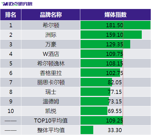 2017年11月,根據邁點研究院(MTA)對國際高端酒店品牌品牌指數的不完全統計,本月國際高端酒店品牌風云榜TOP10依次是希爾頓、洲際、香格里拉、喜來登、萬豪、皇冠假日、希爾頓逸林、四季、威斯汀、W酒店。