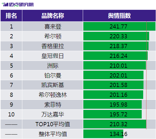 輿情指數上,本月共有8家酒店品牌的指數值突破200,而國際高端酒店品牌的整體輿情指數也達到了134.16,可見市場對于國際高端酒店的認可度相對較高。TOP10品牌中,喜來登依然處于領先優勢。