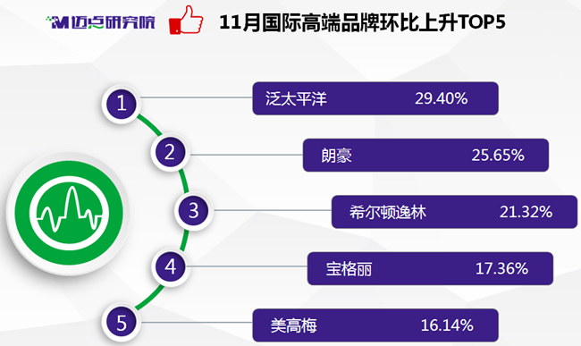 本月邁點研究院(MTA)重點關注的國際高端酒店品牌是“泛太平洋”。在11月的品牌指數及位次升降榜單中,該品牌均位列第一。11月泛太平洋的品牌指數為203.87,較上月上升29.40%;11月排名第29,較上月上升17個位次。