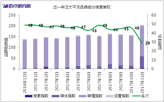 雖然在體量規模上并不占優勢,但得益于集團的良好運營與服務,旗下4家酒店在OTA網站上的好評率均達到了95%左右。從其品牌影響力表現的四個維度數據來看,不斷提高的輿情指數是其品牌影響力上升的基礎。此外,11月份在寧波泛太平洋大酒店舉辦的中國飯店業采購供應年會,也對泛太平洋品牌起到了宣傳推廣作用,其媒體關注度顯著提升。