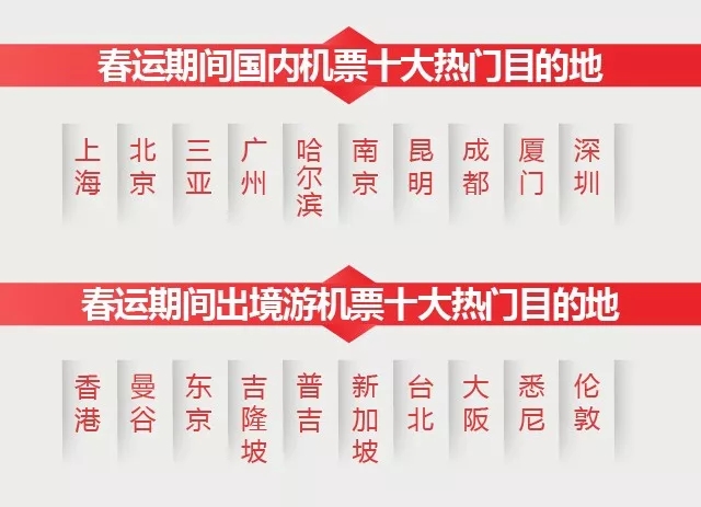 從途牛機票平臺預訂情況看,春運期間國內熱門航線前十名包括:三亞到北京、北京到三亞、哈爾濱到上海、上海到三亞、三亞到上海、上海到哈爾濱、昆明到上海、長春到上海、上海到北京、北京到上海。排名前十的熱門目的地包括上海、北京、三亞、廣州、哈爾濱、南京、昆明、成都、廈門、深圳。從中可以看出,三亞、昆明、廈門等城市均為知名旅游勝地,說明春節期間旅游過年趨勢已越來越明顯。
