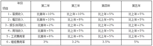 酒店首年可行性財務測算產生后,就可以輕松地測算出第二至第五年酒店經營情況的較為準確的數據,因為測算所依據的參數變化的占少數,不變的占多數,現將變化的參數列表如下予以說明: