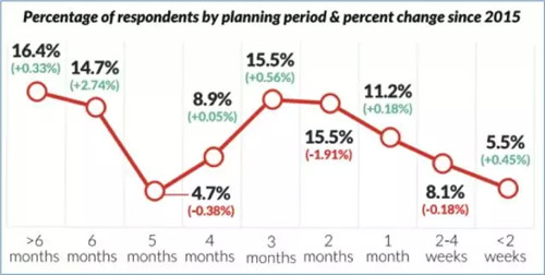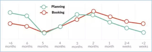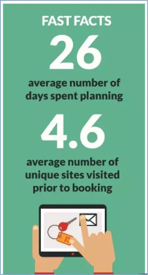 調(diào)查報(bào)告顯示,基本上有兩種類型的度假行程策劃者:即興的旅行規(guī)劃和充分的旅行規(guī)劃。即興的旅游規(guī)劃者往往在出行前的最早3個(gè)月內(nèi)才開始思考和規(guī)劃自己的行程,這一類旅客占絕大多數(shù),比例超過55%。相反,有31.1%的人是充分的旅行規(guī)劃師,他們會提前至少6個(gè)月開始規(guī)劃旅行。雖然消費(fèi)者的一個(gè)總預(yù)訂趨勢是朝著“最后一分鐘才預(yù)訂”的方向發(fā)展,但還是有旅客會提前幾個(gè)月開始研究和預(yù)訂旅程。所以酒店應(yīng)當(dāng)保持與潛在客戶從開始規(guī)劃到整個(gè)購買周期的連續(xù)接觸。