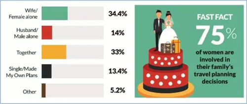 34%的受訪者表示,妻子或者說女性這一方會獨(dú)自計(jì)劃假期,這一比例與去年相比下降了4%,而丈夫或者男性獨(dú)自計(jì)劃假期的比例同比增加了3.5%。約有三分之一的夫婦表示,他們會共同討論和計(jì)劃他們的假期。這就意味著,女性參與休閑度假決策的比例高達(dá)75%以上。另一方面,調(diào)查結(jié)果也說明了我們不能只考慮女性,而忽略男性在旅游規(guī)劃過程中的作用,因?yàn)檫€有54%的男性參與了旅程的規(guī)劃,包括獨(dú)自和同自己的配偶一起完成。