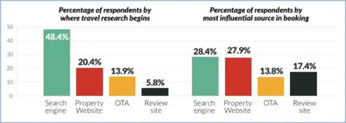使用線上和電話的客戶在他們的規(guī)劃初期使用搜索引擎的頻率要明顯高于其他工具。但是當(dāng)客戶進(jìn)入預(yù)訂階段的時(shí)候,搜索引擎的使用者幾乎與使用酒店官網(wǎng)的用戶數(shù)量持平。另外值得注意的是,如TripAdvisor這樣的旅游評論網(wǎng)站在客戶搜索的初期使用率僅占5.8%,但當(dāng)旅客進(jìn)入預(yù)訂階段之后,受其影響的訪客則達(dá)到17.4%。當(dāng)問到客戶是否會忽略評論而直接預(yù)訂酒店的時(shí)候,83.4%的受訪者表示會先閱讀評論,這一比例與去年同期相比上升了3%。
