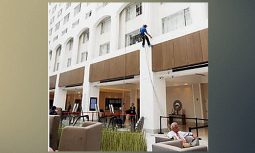 華盛頓市區一五星級酒店內,一位員工懸空,正在進行清潔作業。
