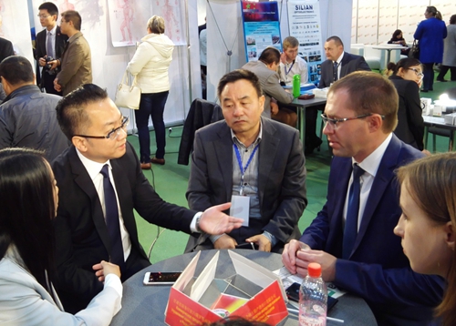 東呈酒店集團副總裁趙俊濤(左)與格羅德諾副市長安德烈(右)在展覽會上會談