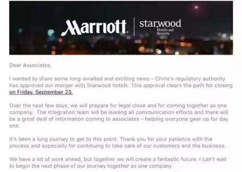 2016年9月20日,萬(wàn)豪國(guó)際發(fā)表聲明稱,中國(guó)商務(wù)部已經(jīng)批準(zhǔn)其收購(gòu)喜達(dá)屋酒店及度假村國(guó)際集團(tuán)的交易。