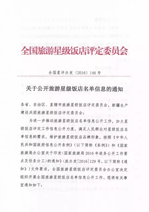 日前,全國星評辦下發(fā)《關(guān)于公開旅游星級飯店名單信息的通知》,組織各省、自治區(qū)、直轄市旅游星級飯店評定委員會,新疆生產(chǎn)建設(shè)兵團旅游星級飯店評定委員會開展全國旅游星級飯店名單信息公開工作。這意味著某飯店幾星級、所在地區(qū)、星級標(biāo)牌編號今后都將“上網(wǎng)可查”。