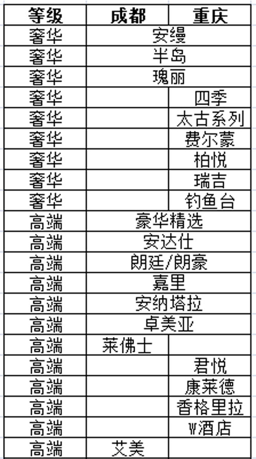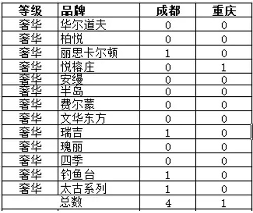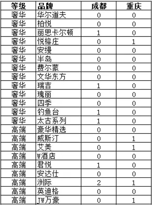在豪華等級方面,成都和重慶旗鼓相當都是9個品牌已經進駐,成都則以多1家酒店小勝重慶。
