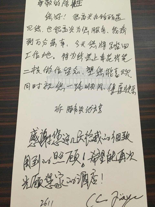 據了解,酒店管家部推出了一項“貼身管家團隊”服務,雖然只作為整體接待方案的一部分,但是將人文關懷發揮到得淋漓盡致。“貼身管家團隊”在接待期間總能非常細致的關注到賓客的需求:如為記者朋友提供鼠標墊,并寫下溫馨的留言便簽;為德國賓客送上鞋架,便于鞋子擺放整齊;為意大利客人縫補并熨燙西裝;贈送了9月2日到店的意大利記者中國臉譜書簽等等。這些小小細節的關注,為境外媒體記者帶來了溫暖和驚喜。樓層員工小張表示,讓賓客滿意是基礎,創造驚喜是追求,希望每一位媒體記者在住店期間都能感受到我們殷勤好客的熱情和細致入微的服務。接待期間,“貼身管家團隊”共收到了書面感謝信37件,贏得境外媒體的廣泛好評。