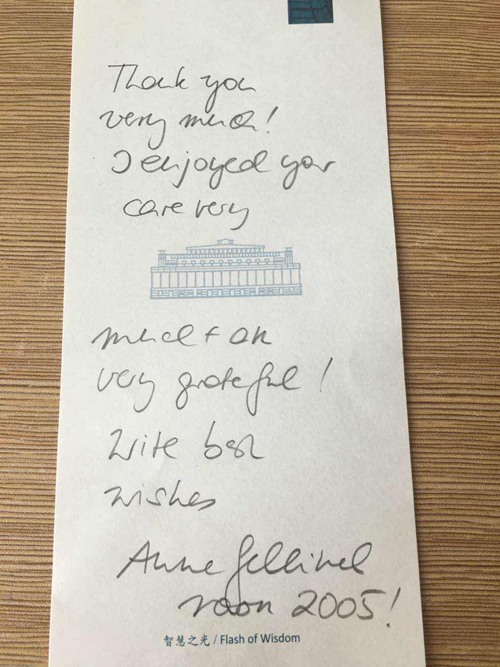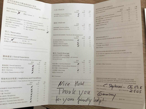 除了在店內留下的感謝信、感謝留言之外,外媒記者離店后還專門向酒店發來感謝郵件,其中有法國駐上海總領事館副總領事Thomas ROLLET(馬彥斌)、德國駐京記者一處資深記者陳女士、香港鳳凰衛視新聞制作部郭女士等。