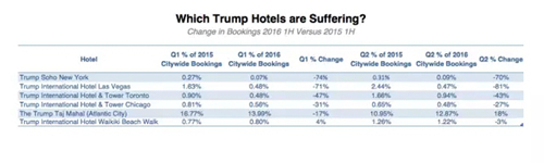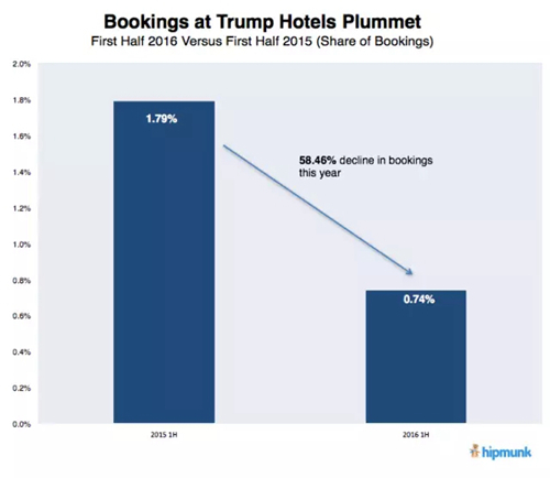 據(jù)美國旅游搜索網(wǎng)站Hipmunk統(tǒng)計(jì),2016年上半年全美的特朗普酒店預(yù)訂數(shù)量的市場份額同比減少58%,可以說是暴跌。該網(wǎng)站的用戶多為城市地區(qū)的年輕人,似乎在特意避開特朗普品牌。