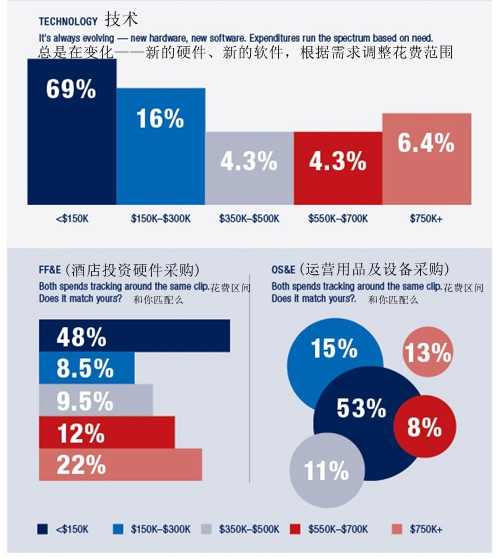 FF&E(酒店投資硬件采購)方面,和技術一樣在支出的基礎上有所突破。雖然約48%的受訪者表示他們將花費不到15萬美元,但22%的受訪者表示他們將花費超過75萬美元。 較少的受訪者,約12%表示他們將在FF&E上花費55萬美元到70萬美元。 同時,超過一半的人表示他們在OS&E(運營用品及設備)上花費不到15萬美元。