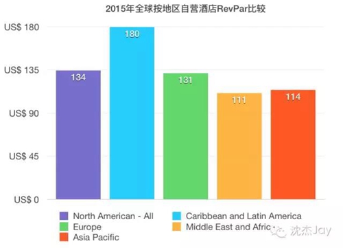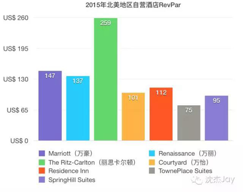 2015年各品牌的RevPAR均較前一年有提升,從品牌上來(lái)看,北美地區(qū)麗思卡爾頓的RevPAR達(dá)到了259美元,遠(yuǎn)遠(yuǎn)高于其他品牌。