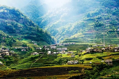 路上,耶律往窗外亂看,突然一個村子闖進(jìn)視野。層巒腳下,梯田之上,幾間白色平房,錯落拼湊出一個小村子的模樣,滿眼都是深深淺淺的綠色和霧氣蒸騰。