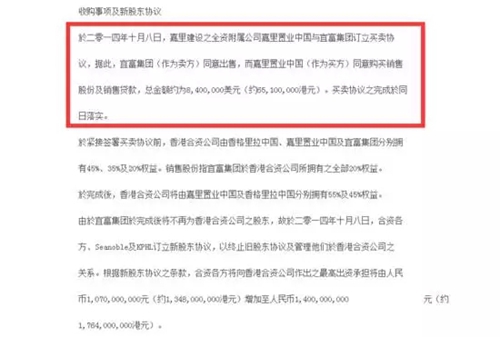 2014年10月8日,宜富集團退出昆明香格里拉大酒店項目,嘉里建設發布公告,公告顯示嘉里建設全資附屬公司嘉里置業(中國)有限公司與宜富集團簽訂買賣協議,以總額約840萬美元(約6510萬港元)收購宜富集團持有香格里拉國際飯店(昆明)有限公司的20%股權。交易完成后,香格里拉國際飯店(昆明)有限公司將僅由嘉里置業(中國)及香格里拉中國兩家控股,其中,嘉里置業占股從35%增加至55%,成為香格里拉國際飯店(昆明)有限公司最大的股東。