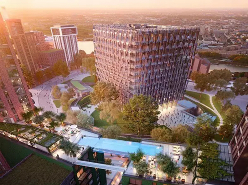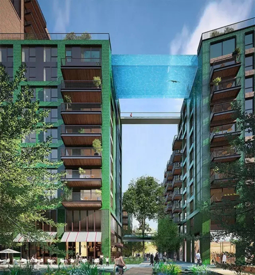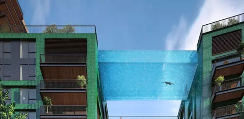 這個(gè)通體透明且無結(jié)構(gòu)的泳池被稱為“SkyPool”,坐落在倫敦泰晤士河岸新區(qū)、巴特西發(fā)電廠旁邊,高懸在10層樓之上,長約27.4米,高約33.5米。