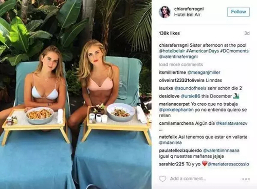全球最火的時尚博主Chiara Ferragni拉著做設(shè)計(jì)的妹妹一起,兩個人輪流在Instagram發(fā)同一張照片,定位都是Hotel Bel Air。真是名副其實(shí)的“網(wǎng)紅”酒店。