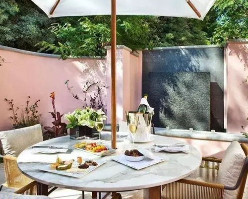 整個酒店的主色調(diào)就是去年潘通公司評出來的年度色——玫瑰石英粉,更多了點(diǎn)布達(dá)佩斯大飯店的味道,離比弗利山莊也不遠(yuǎn),總之一切都很夢幻……