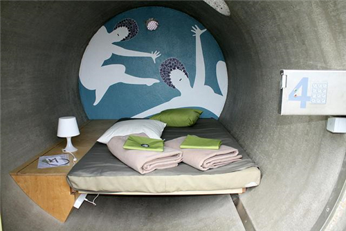 這座管道旅館位于奧地利的Ottensheim公園內,從每年的5月份開放到每年的10月份,盡管外部是由混凝土特意澆灌成的管道形狀,但內部還是有一定舒適性的。內部活動的空間不大,床下有一些儲存空間,房間內也有充電的地方和燈。同時屋內配備羊毛毯和輕棉睡袋。但是所有其他設備(包括廁所、淋浴、迷你酒吧、咖啡廳、等)都是由周圍的公共空間提供。言下之意就是除了管道可以睡覺之外其他什么都不可以做。