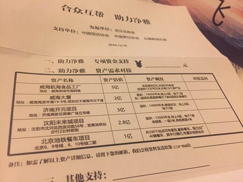 “幫扶計(jì)劃”共列出凈雅5項(xiàng)資產(chǎn),其中威海大廈(建于2009年)、濟(jì)南開元項(xiàng)目(建于2010年)和沈陽(yáng)未來(lái)城項(xiàng)目(建于2012年),屬于凈雅自有物業(yè),以前用于經(jīng)營(yíng)門店,均位于當(dāng)?shù)攸S金地段,占地面積1萬(wàn)平米以上,共估值7.8億元。威海航海食品工廠建于2010年,占地500畝,曾用于凈雅海參和魚蝦等海鮮產(chǎn)品的儲(chǔ)藏和初加工,估值5億元。北京地鐵餐車項(xiàng)目是2013年8月凈雅為謀求轉(zhuǎn)型,通過收購(gòu)“天天見面”推出的大眾餐飲項(xiàng)目,可在北京240個(gè)地鐵站點(diǎn)提供餐車服務(wù)。