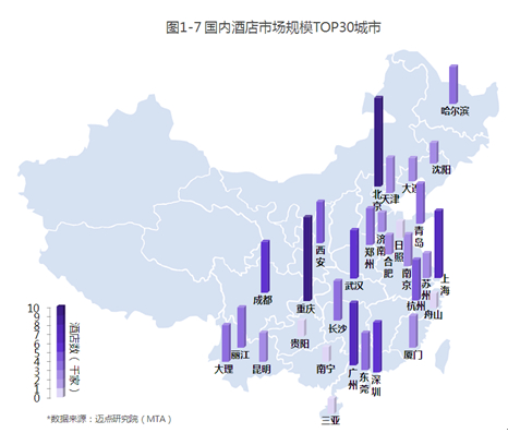 值得關注的是,成渝旅游經濟圈的崛起也讓西南地區酒店業實現快速趕超。這也使得西南代表城市重慶一躍超過上海、廣州、深圳,成為國內酒店市場規模第二大的城市,僅次于北京。與此同時,西北與東北地區城市酒店市場仍有待進一步盤活與開發。