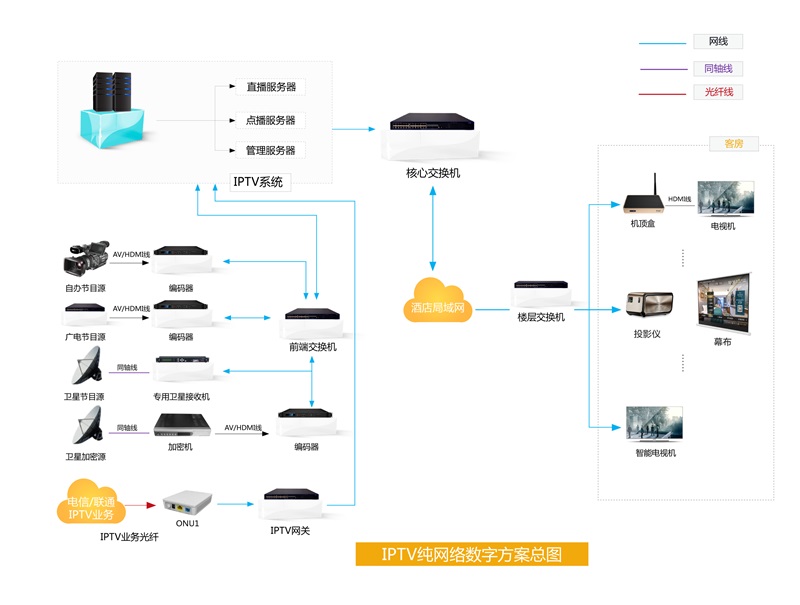 ? 頭端設(shè)備:天線、衛(wèi)星接收器、編碼器、數(shù)字接收機(jī)等,用于接收直播電視信號(hào)源,其中天線,衛(wèi)星接收器,有線電視信號(hào)等信號(hào)源和接收裝置需要酒店預(yù)先準(zhǔn)備。