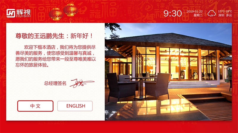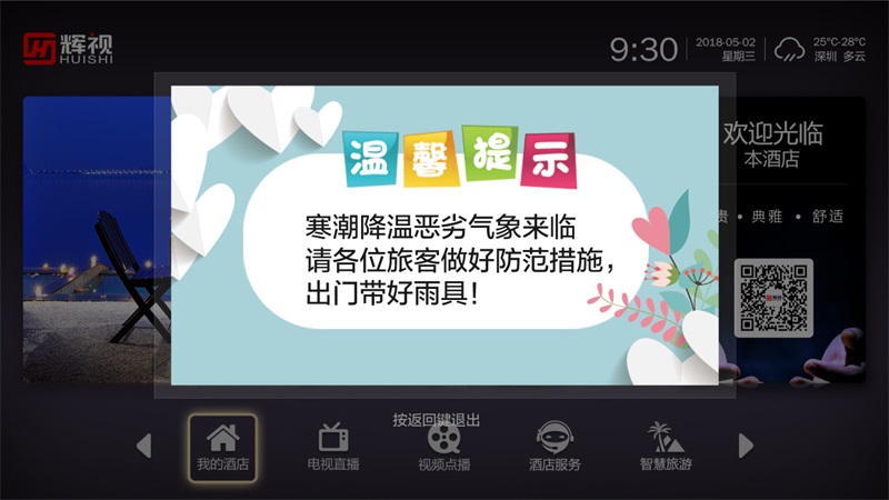 節(jié)日祝福:系統(tǒng)與酒店管理系統(tǒng)(PMS)等進(jìn)行無縫對(duì)接,通過TV終端自動(dòng)為客人送來溫馨節(jié)日/生日/紀(jì)念日文字祝福,同時(shí)自動(dòng)場(chǎng)景界面換膚,附加動(dòng)畫渲染效果,讓客人倍感溫馨的關(guān)懷、賓客如歸的感覺