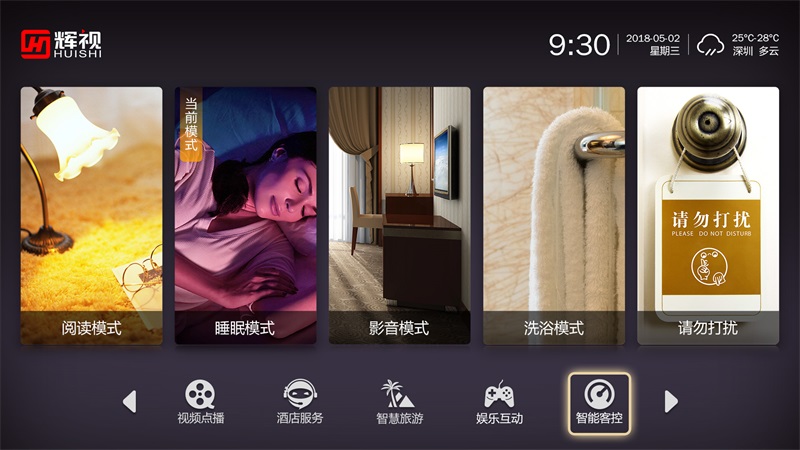 智能客控:酒店智能客控,聰明你的酒店。智能客控系統(tǒng)只需使用遙控器就可實(shí)現(xiàn)燈光、窗簾、電視、空調(diào)、音樂服務(wù)控制。
