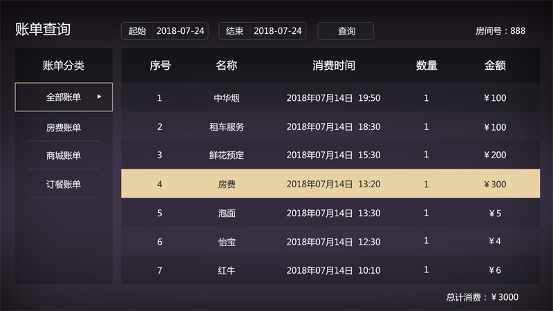綜合查詢:系統(tǒng)對(duì)用戶本次入駐所有消費(fèi)記錄清單記錄查詢,包括房費(fèi)、餐費(fèi)、購物、娛樂項(xiàng)目及費(fèi)用查詢;