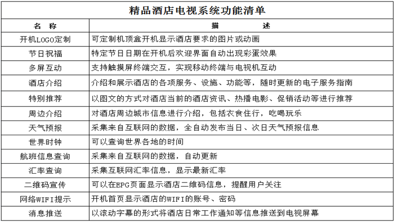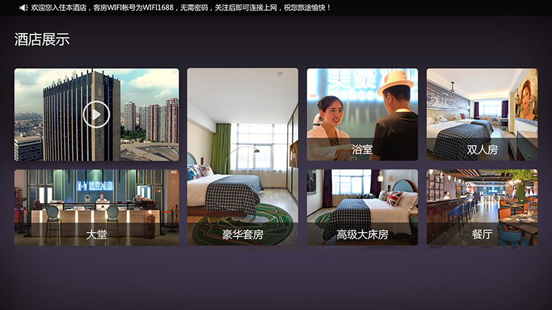 餐飲服務(wù):以文字、視頻、圖片、幻燈片等方式,介紹酒店餐飲、酒水、預(yù)購電話提示,也可和酒店PMS對(duì)接 實(shí)現(xiàn)下單功能,需收費(fèi)實(shí)現(xiàn)